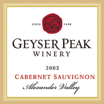 Geyser Peak Cabernet Sauvignon 2005 "Known for luscious Cabernet Sauvignons, this wine is a classic example of Geyser Peak Winery’s intense, lively style. Forward fruit characters of black cherry and blackberry dominate the aromas, with underlying grace notes of dark chocolate and spice. In typical Geyser Peak style, the bright fruit is nicely supported by a restrained oak character. The palate is rich, round and lush, seamlessly pairing the cherry and berry fruit with a hint of spice and vanilla. The fine-grained tannins meld into a persistent, lingering finish." |