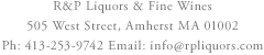 Welcome to R&P Liquors & Fine Wines in South Amherst, MA!  Since 1968, we have been providing our customers with outstanding products and outstanding service...all at affordable prices.